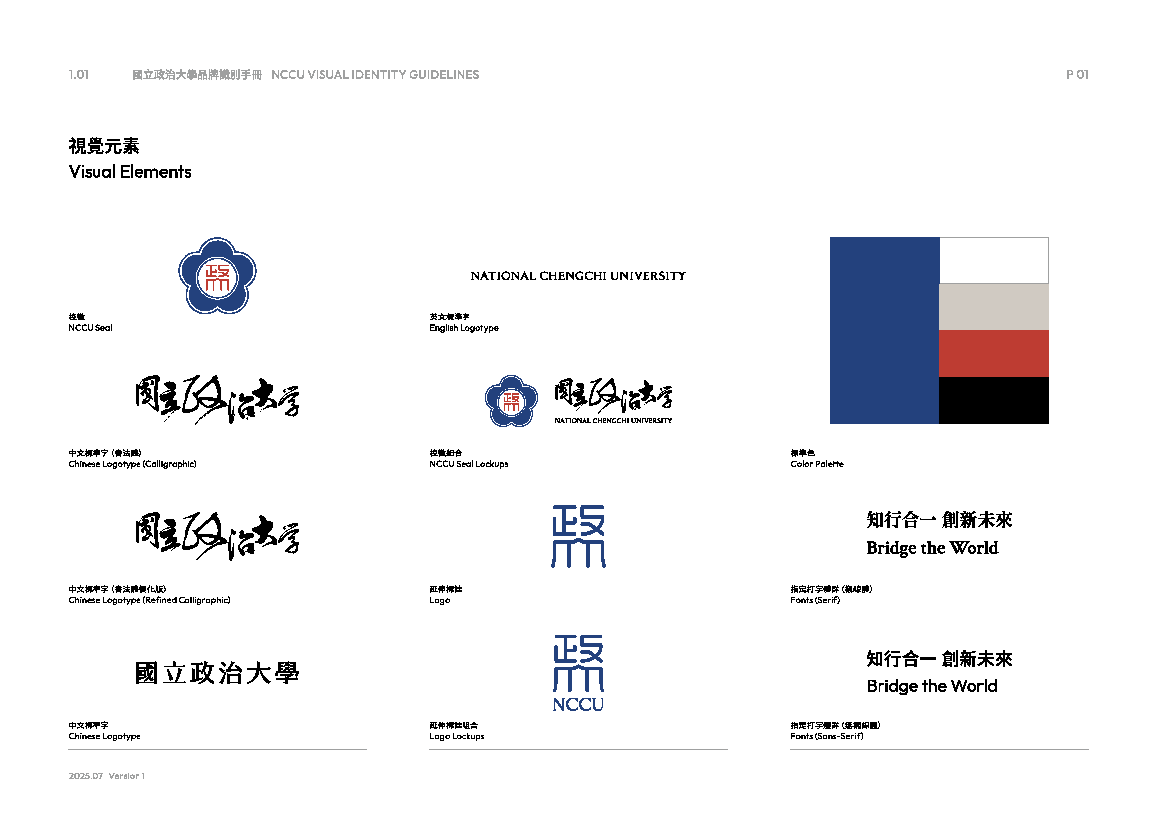 政大識別已走過百年,面對時代轉變,在不失原貌的前提下,提出更符合數位時代使用的識別設計。識別系統的優化不僅是回應設計語言的現代化需求,更是提升在數位環境中的應用彈性與辨識度。